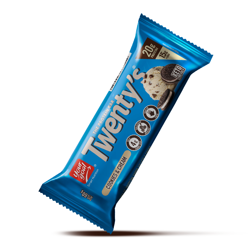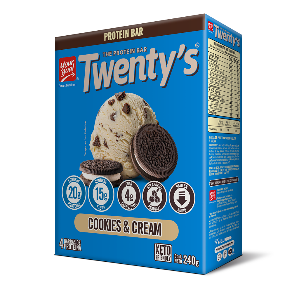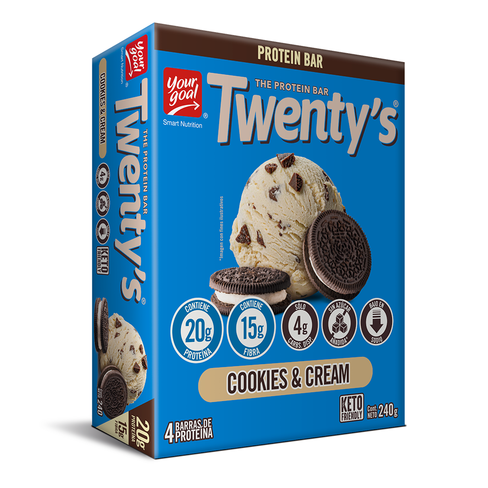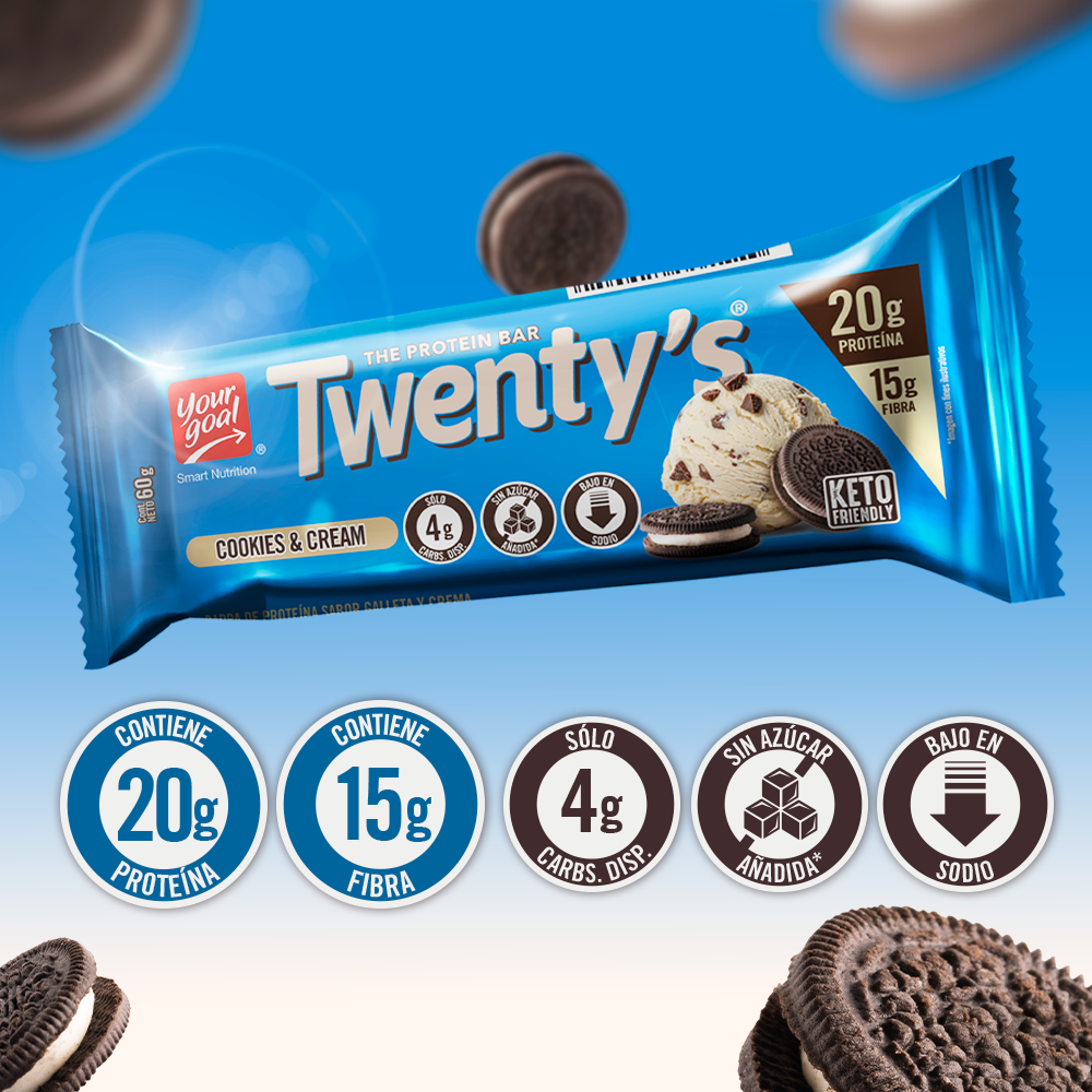 Sin duda la barra perfecta. Twenty's Cookies & Cream, el clásico sabor de galleta y crema en una deliciosa barra alta en proteína, suave y cremosa con un ligero crunch que le da un toque irresistible. Su alto contenido de proteína y fibra prebiótica te entregará saciedad por horas. Son libres de sellos y sin azúcar añadida. La opción perfecta para dietas hipocalóricas, hiperproteicas, bajas en carbos y keto friendly. ¡Let's Go!